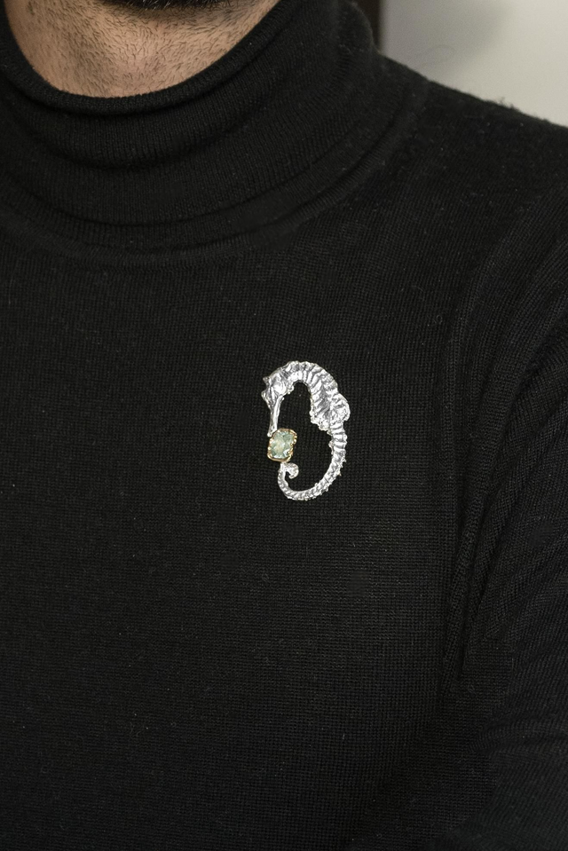 Créature méditerranéenne, l’hippocampe incarne la monture de Poséidon. Silencieuse, sa silhouette garde en elle la mémoire des profondeurs et évoque un messager marin chevauchant l’immensité de son royaume. L'aigue-marine introduit sa clarté froide, ses secrets bleus.