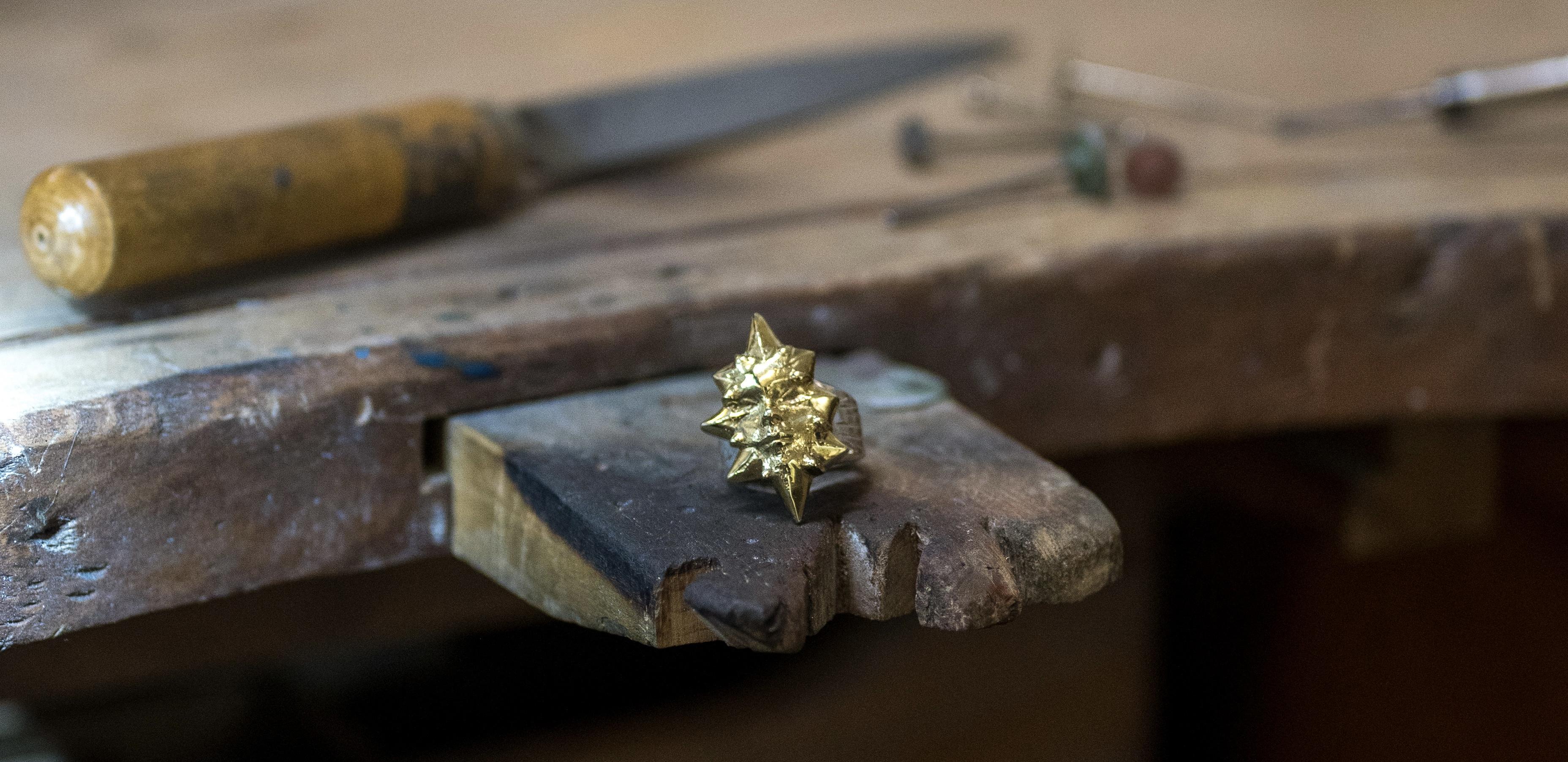 Aujourd’hui, je crée des pièces uniques en or et en argent, dans une approche brute et instinctive. Textures marquées, formes organiques, volumes assumés, loin des standards lisses de la bijouterie classique.