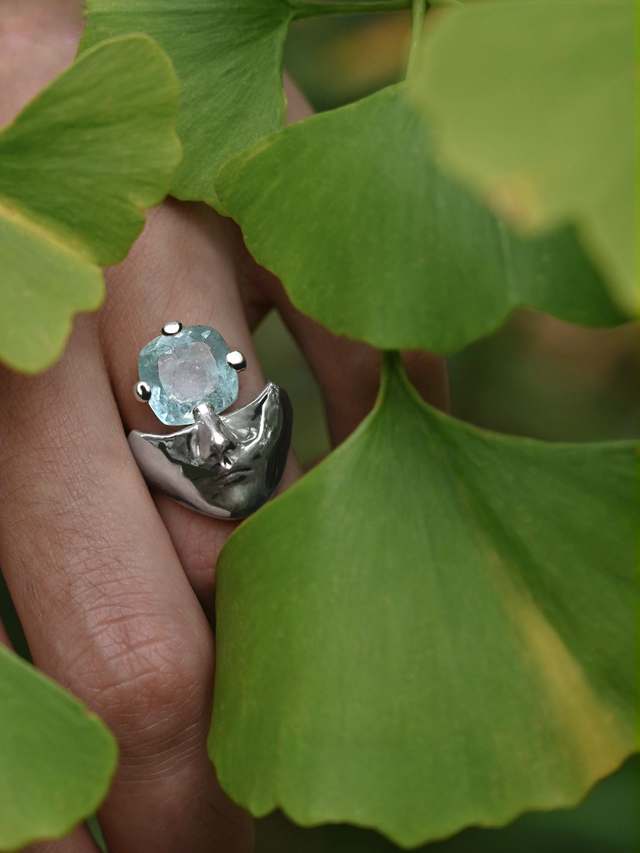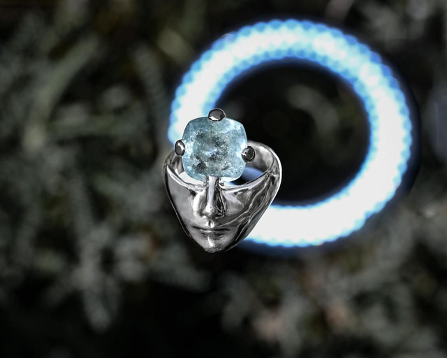 L'aigue-marine, pierre associée aux eaux profondes et à la clarté d'esprit, prend ici la place de l'œil unique - symbole de vision intérieure, de lucidité.