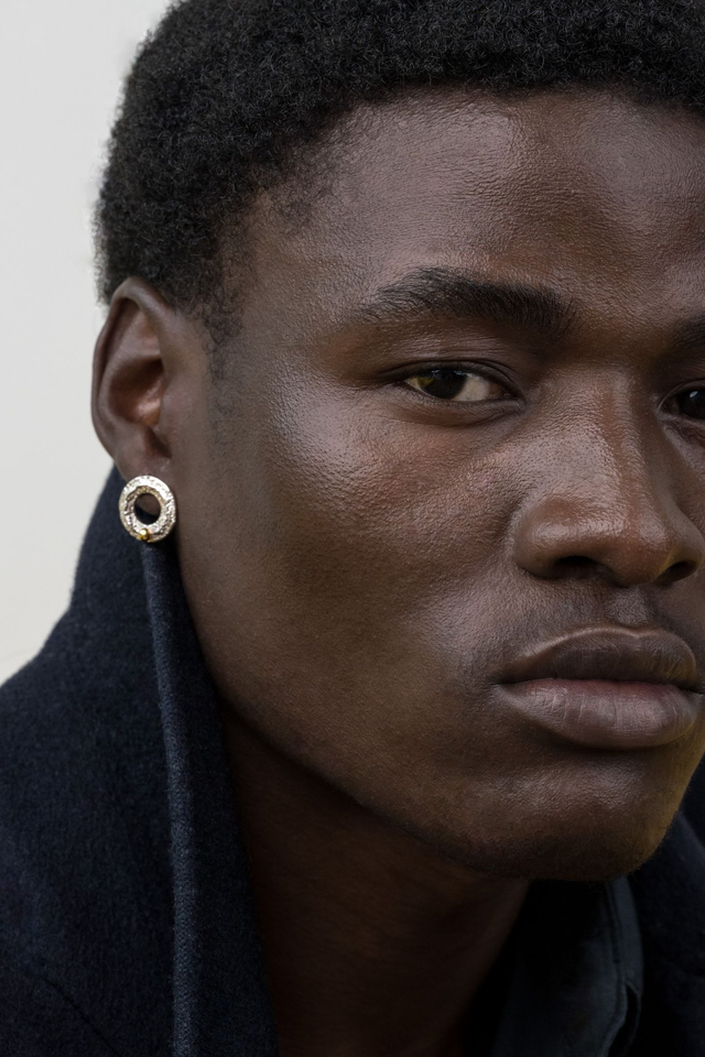Deux cercles texturés, une pépite en or posée à la base, crée un contraste simple et équilibré